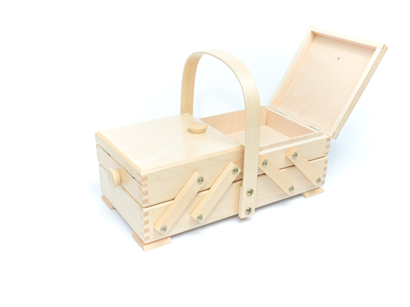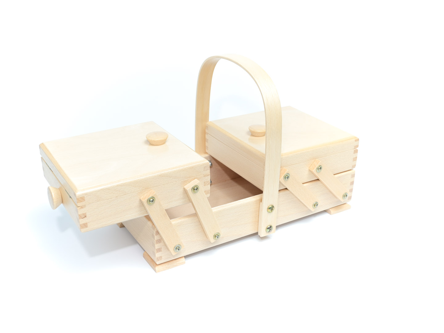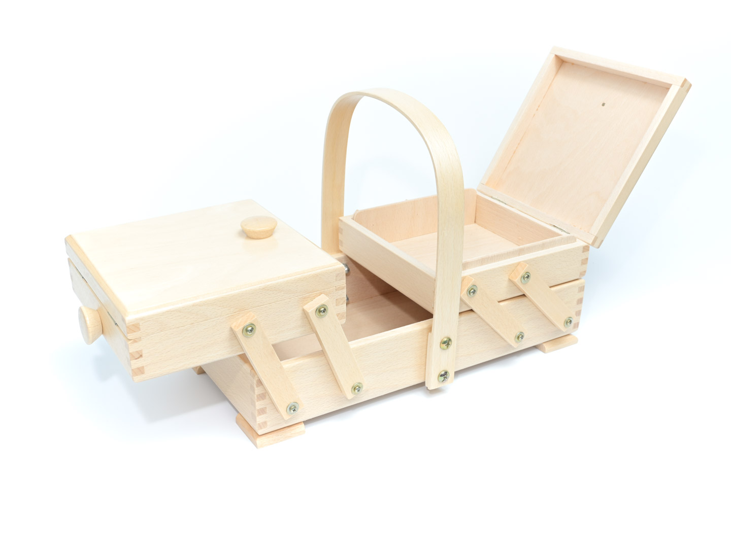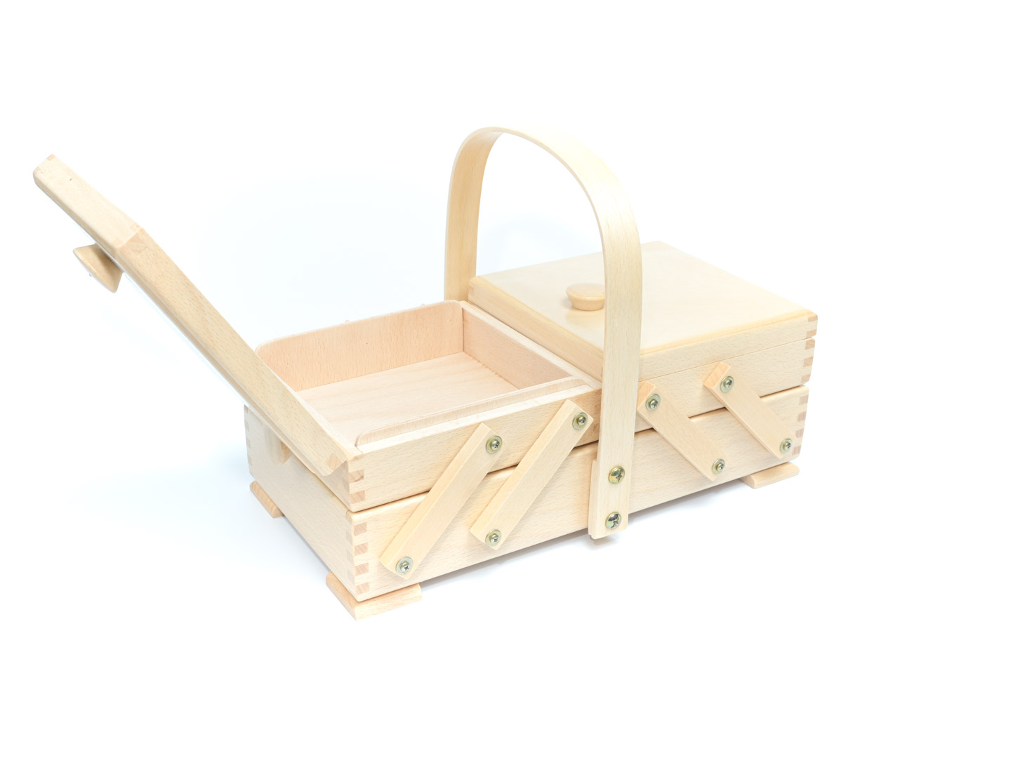 Idéal pour ranger vos accessoires et matériels de couture. Travailleuse couture en Bois naturel dotée de tiroirs dépliants et d’une poignée de transport.